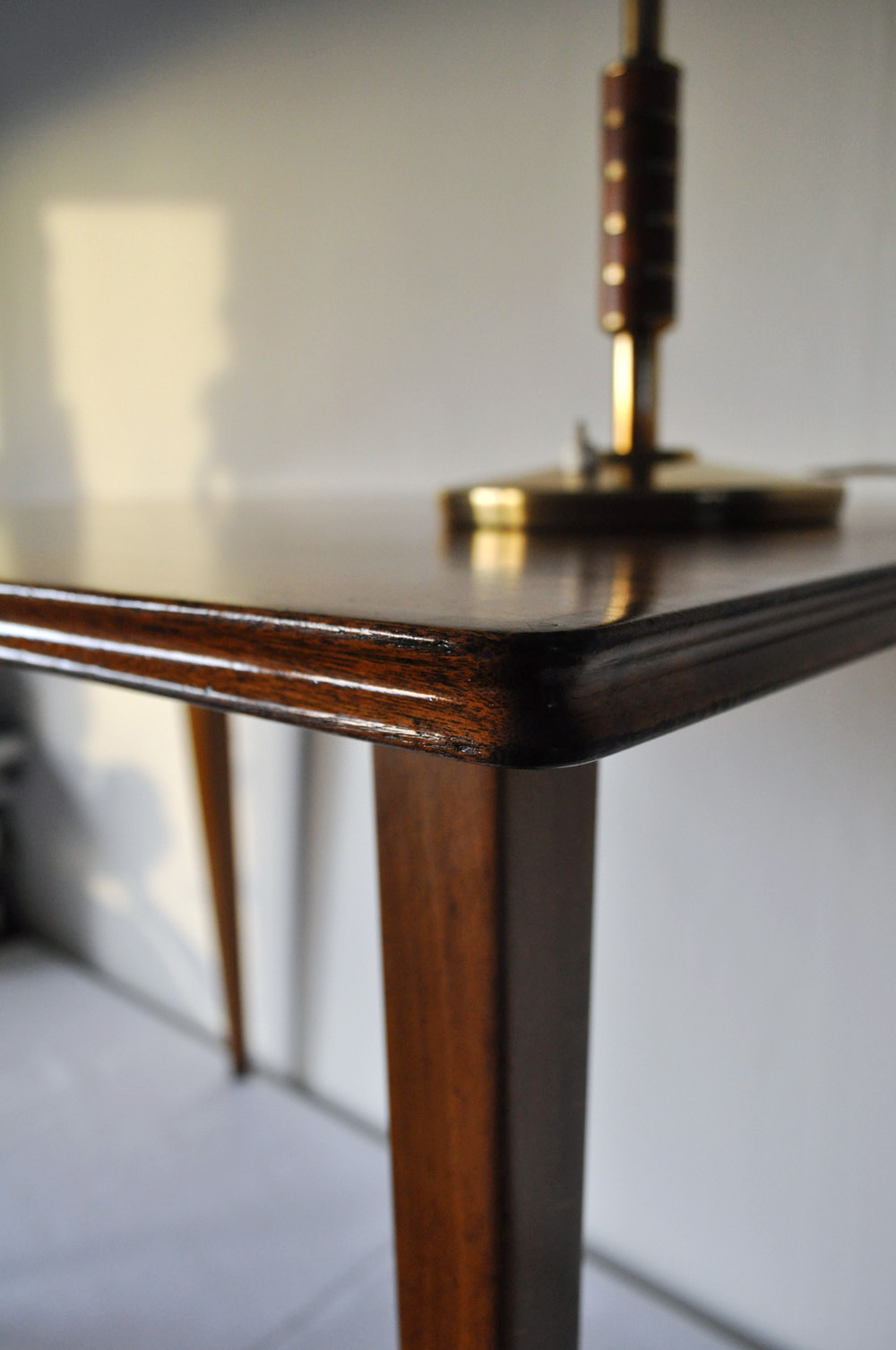 Side table with a concave edge and standing on tapering legs, excellent craftsmanship. Attributed to Palle Suenson who designed and furnished the office building of the Aarhus Oliefabrik (1938-1942) from where this table comes from.