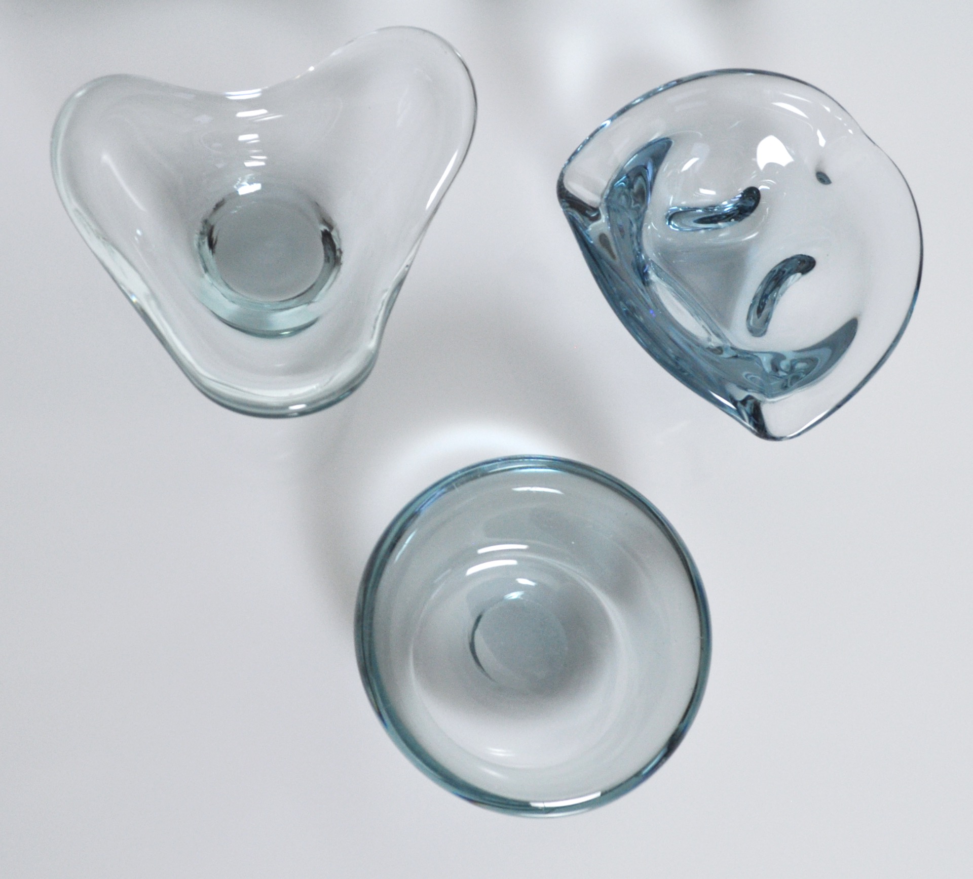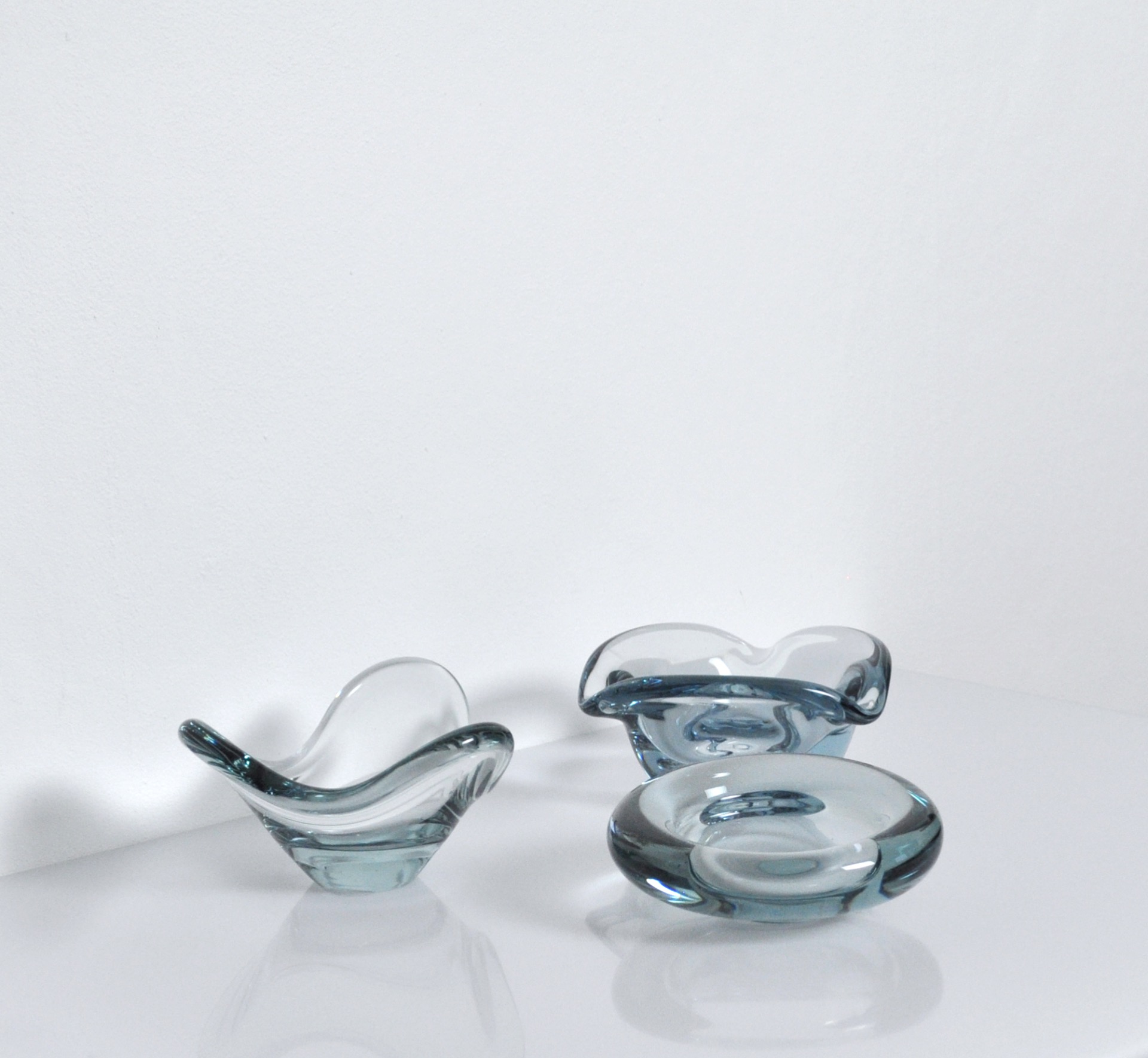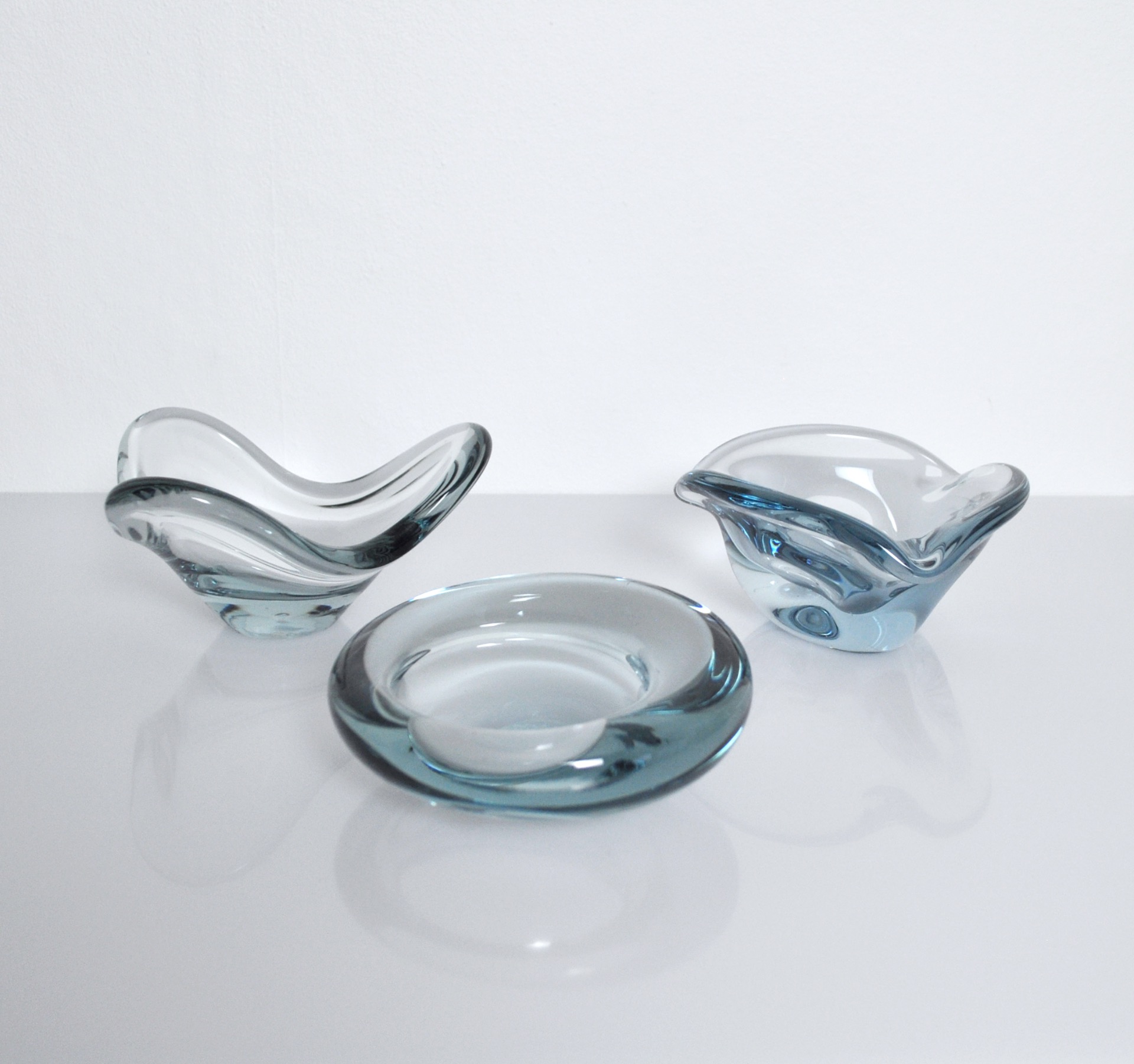 Set of 3 smaller dishes or ashtrays designed by Per Lütken and Christer Holmgren for Holmegaard in the 1950s to 1970s. One item from the Fionia series is sign by Per Lütker, 1961.