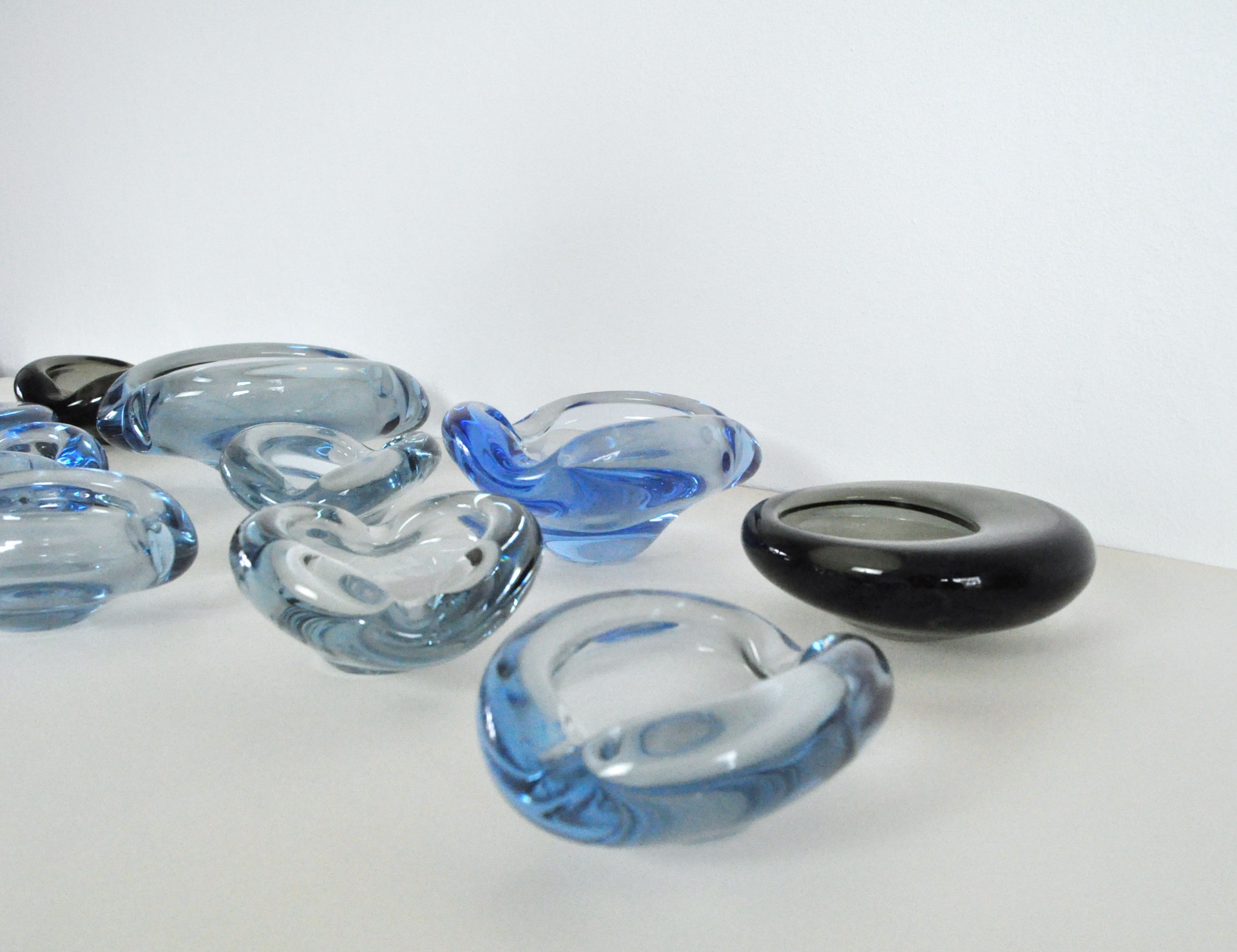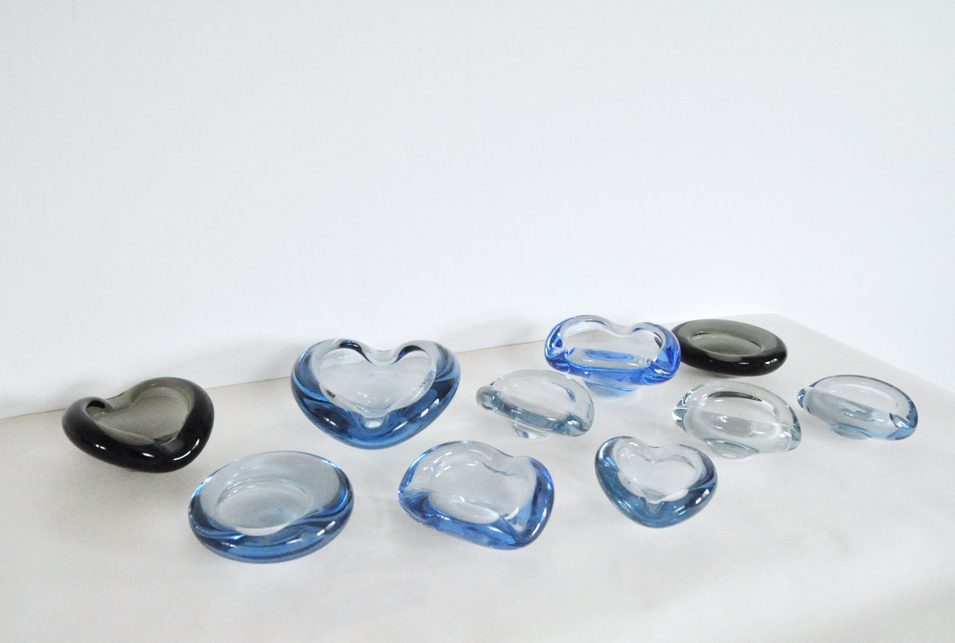 Set of 10 smaller dishes or ashtrays designed by Per Lütken and Christer Holmgren for Holmegaard in the 1950s to 1970s.