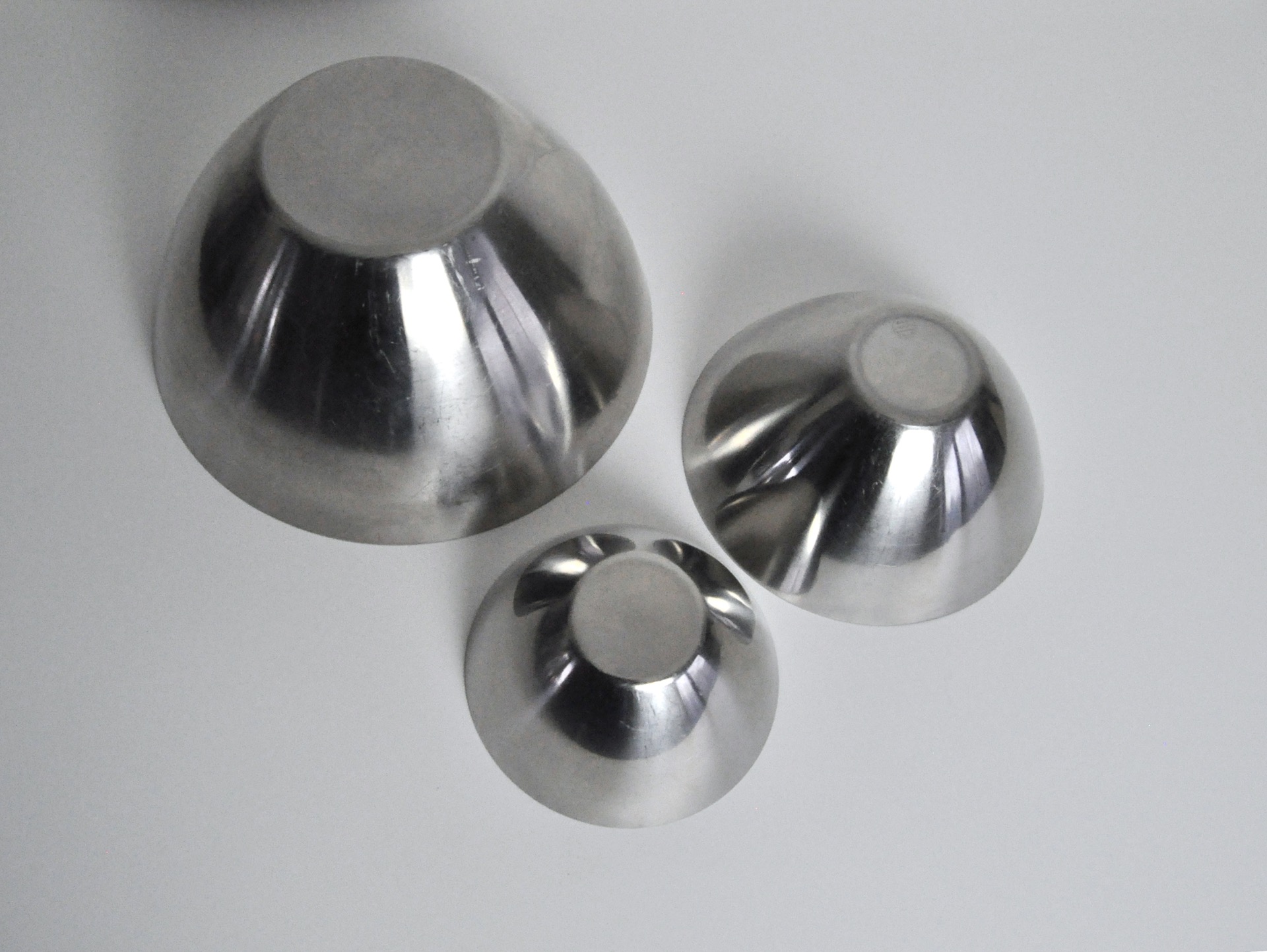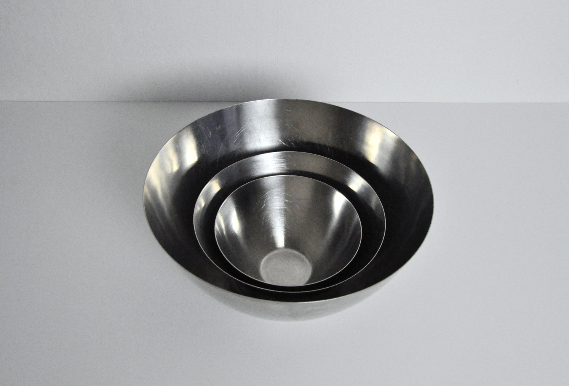 Set of 3 bowls by DKF Lundtofte stainless steel, Denmark. Attributed to the Norwegian industrial designer Tias Eckhoff. Eckhoff made an extensive kitchen series for Lundtofte, Denmark in the 1960s.