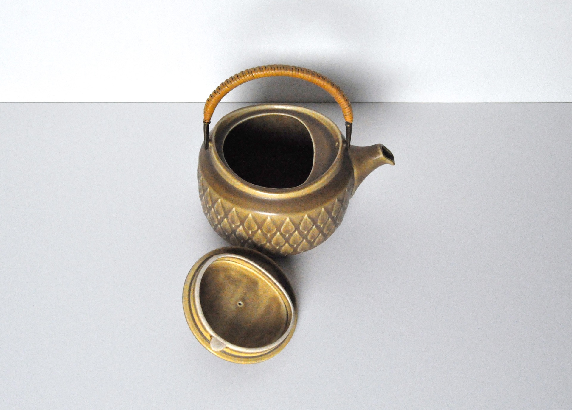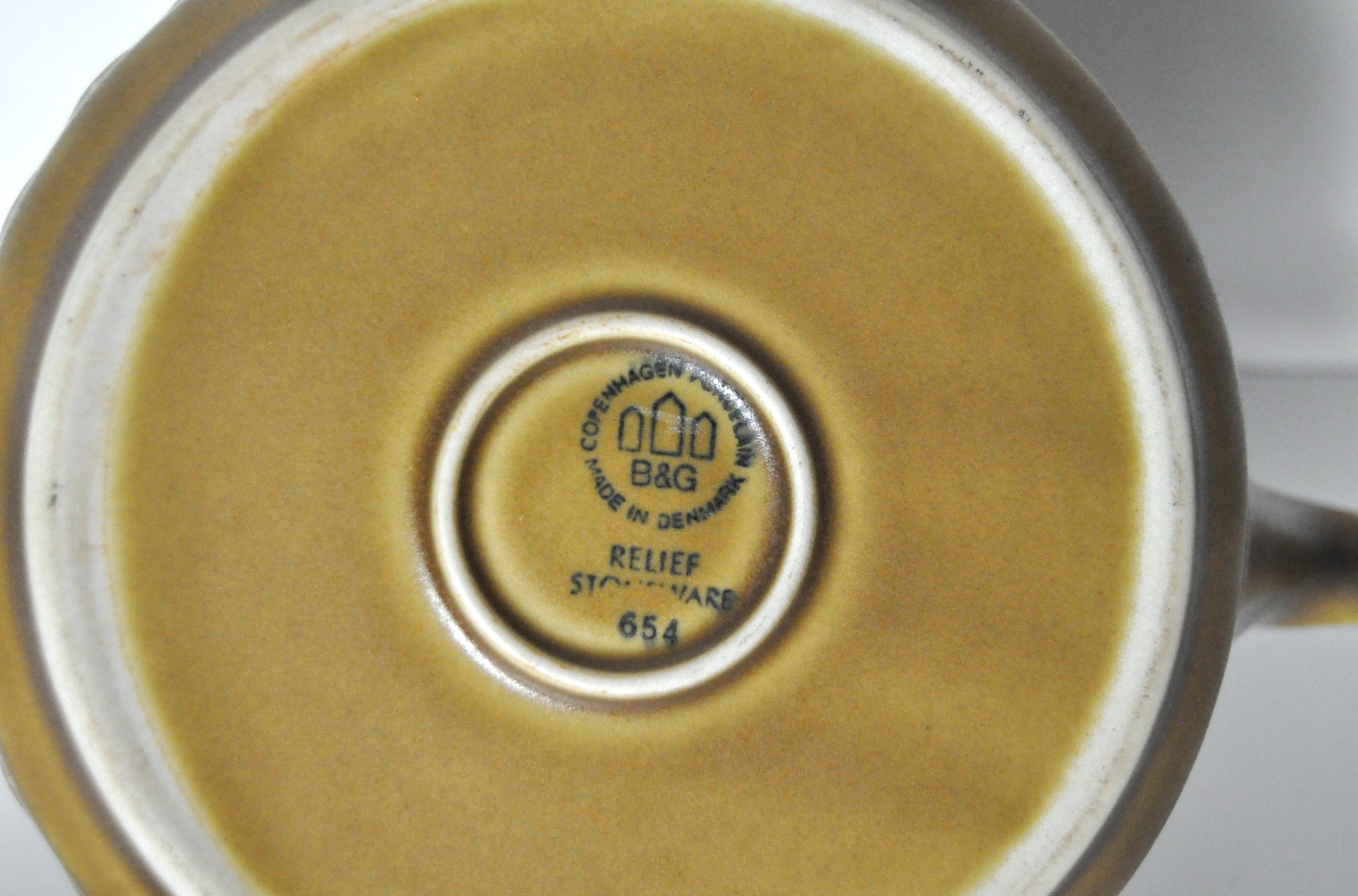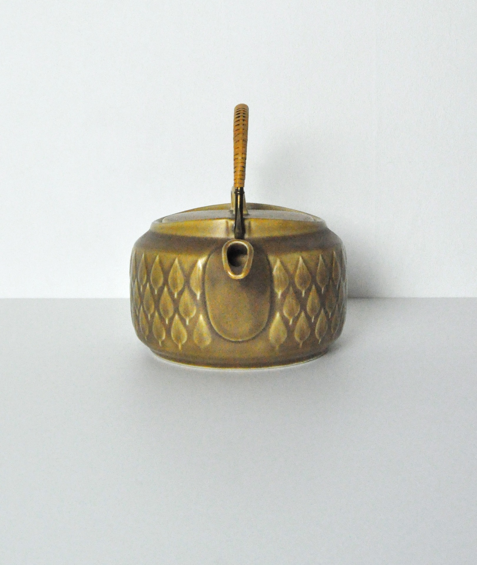 Tea Pot designed by Jens H. Quistgaard for Kronjyden / Bing & Grøndahl, 1960s. The tea pot is from the series "Relief" made in glazed stoneware in mustard yellow shades.