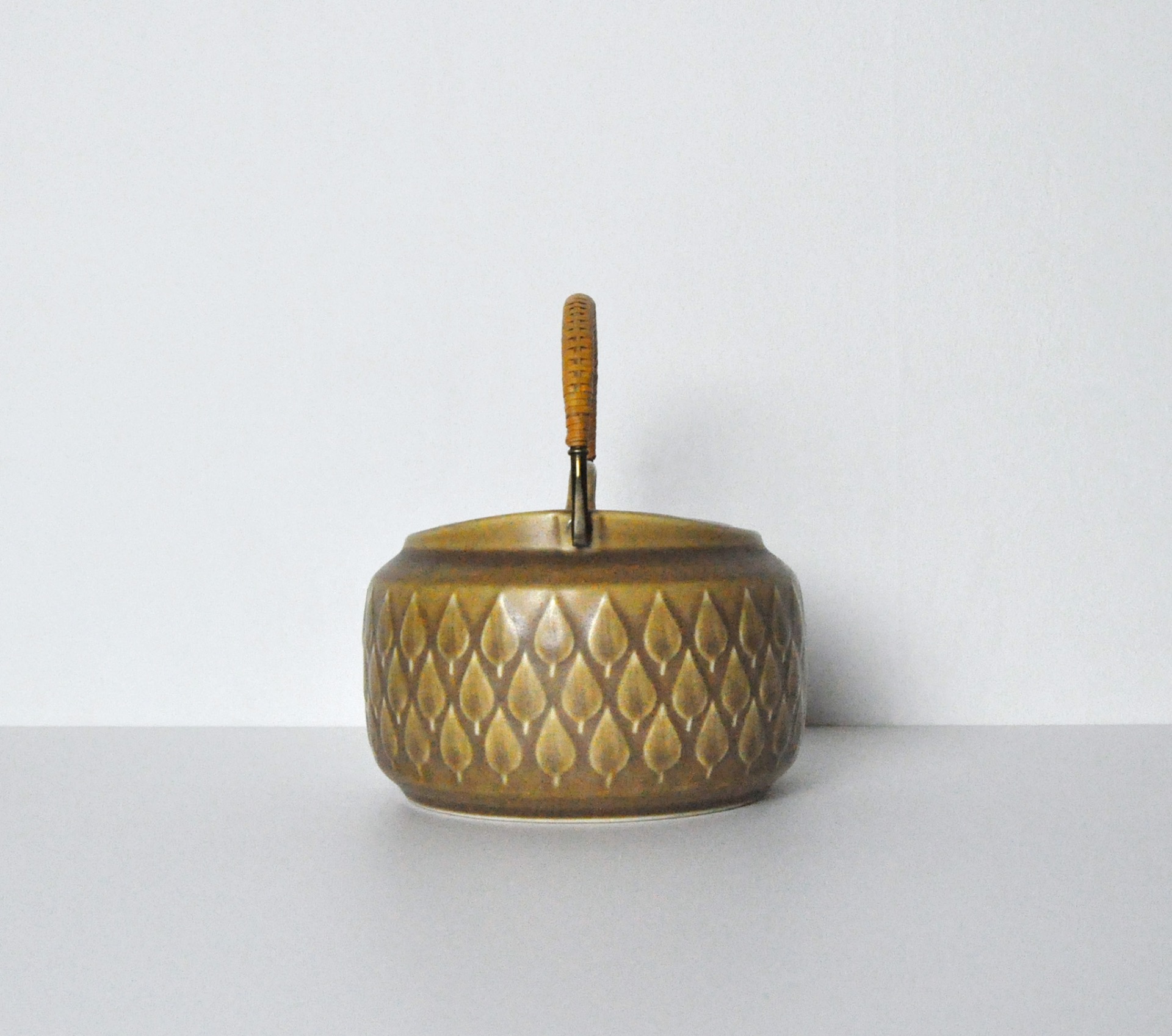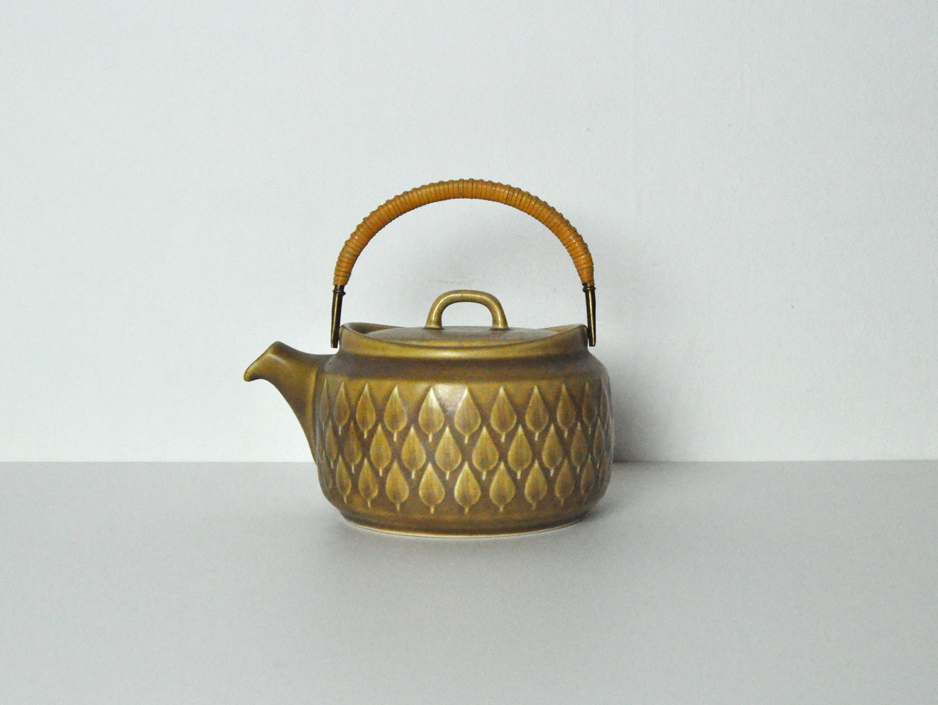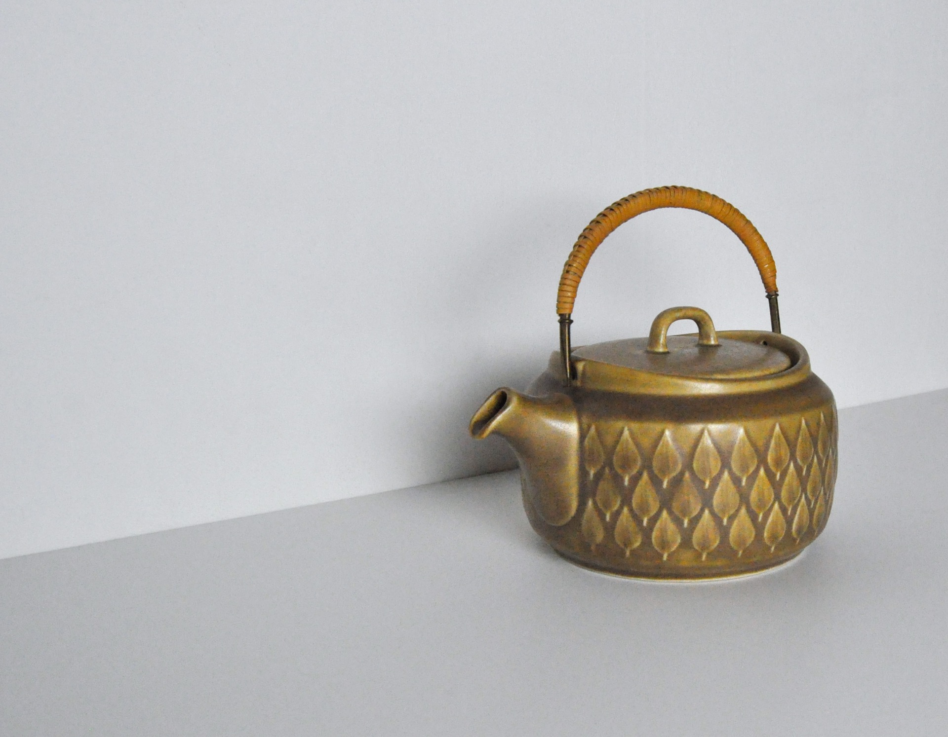 Tea Pot designed by Jens H. Quistgaard for Kronjyden / Bing & Grøndahl, 1960s. The tea pot is from the series "Relief" made in glazed stoneware in mustard yellow shades.