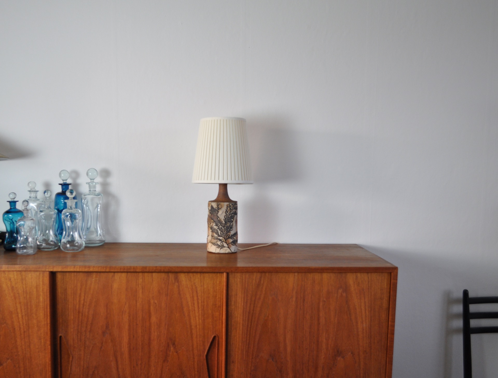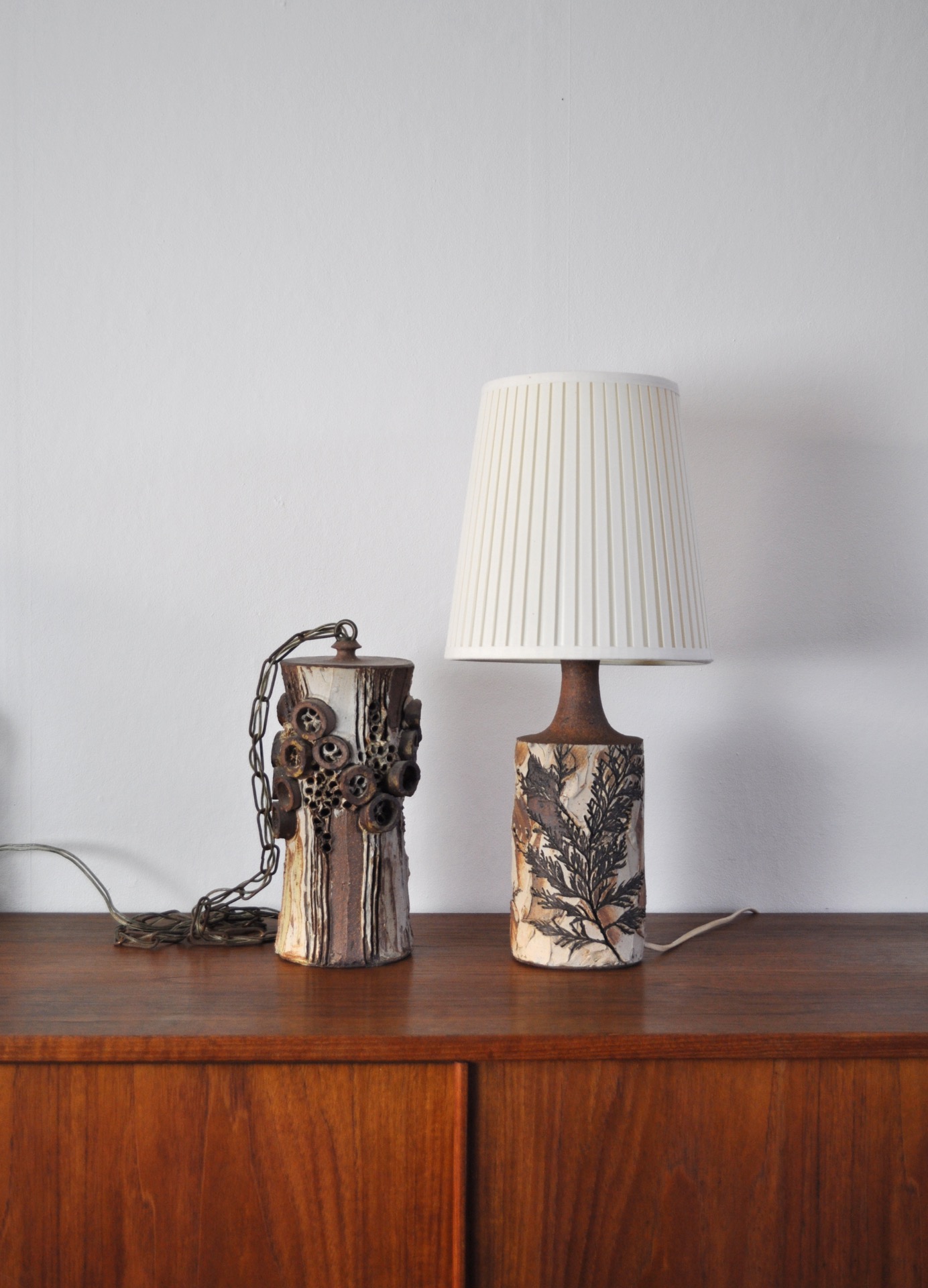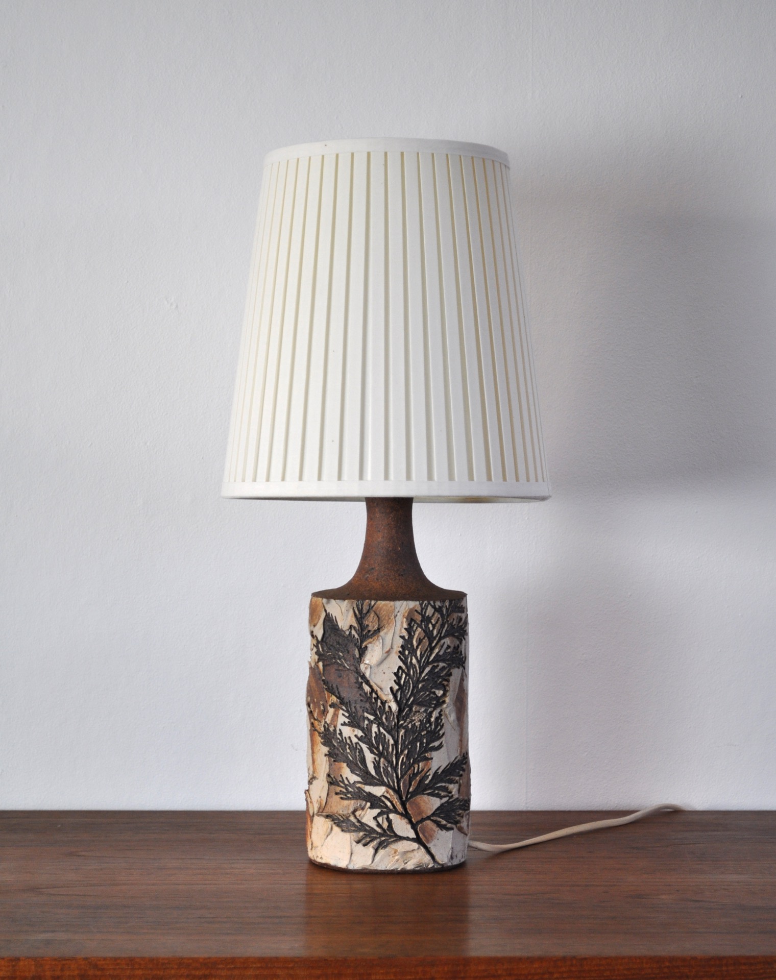 Handmade and hand decorated Danish Mid-Century Modern ceramic table lamp by Bodil Marie Nielsen. Imprints of leaves and stems in brown nuances.
