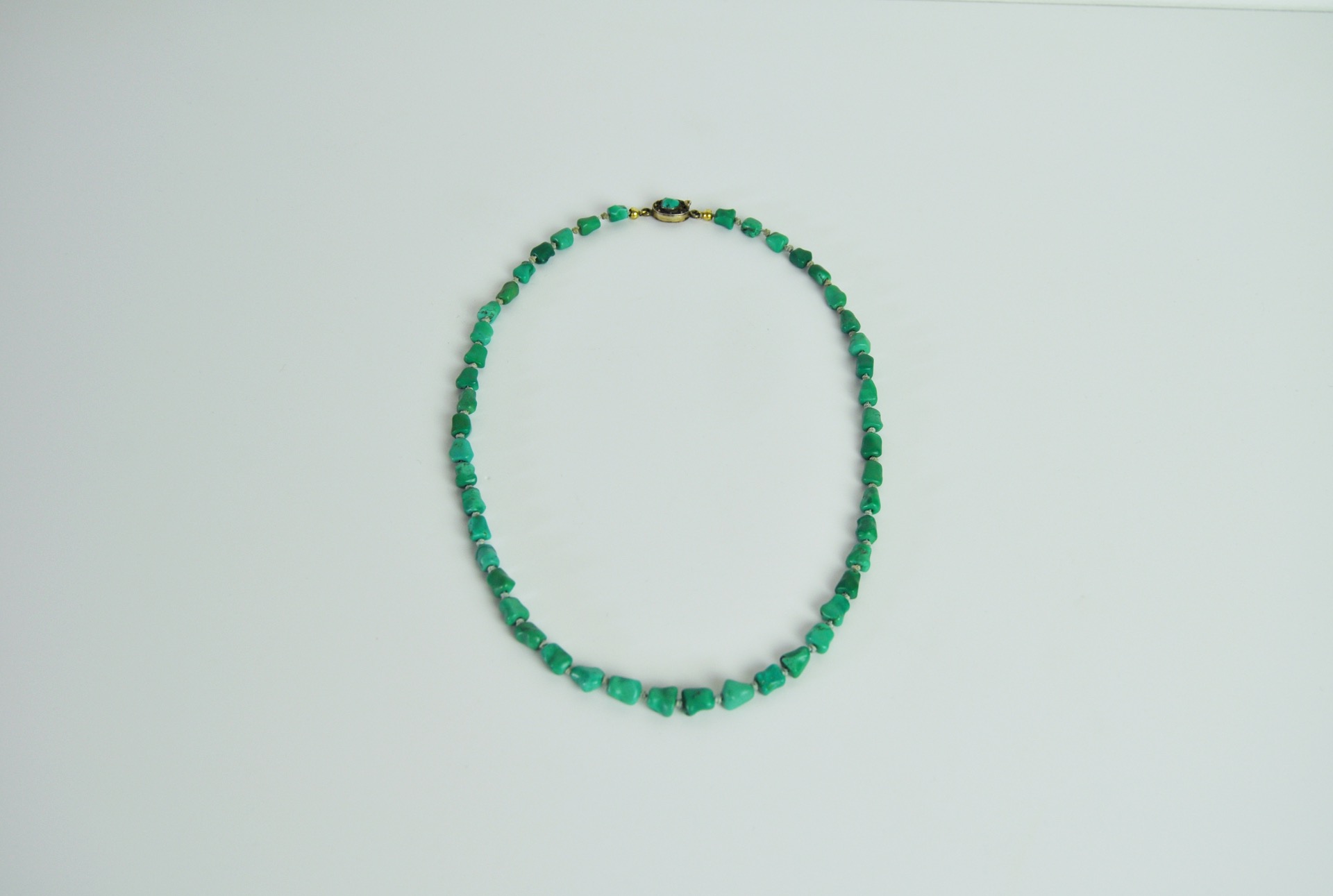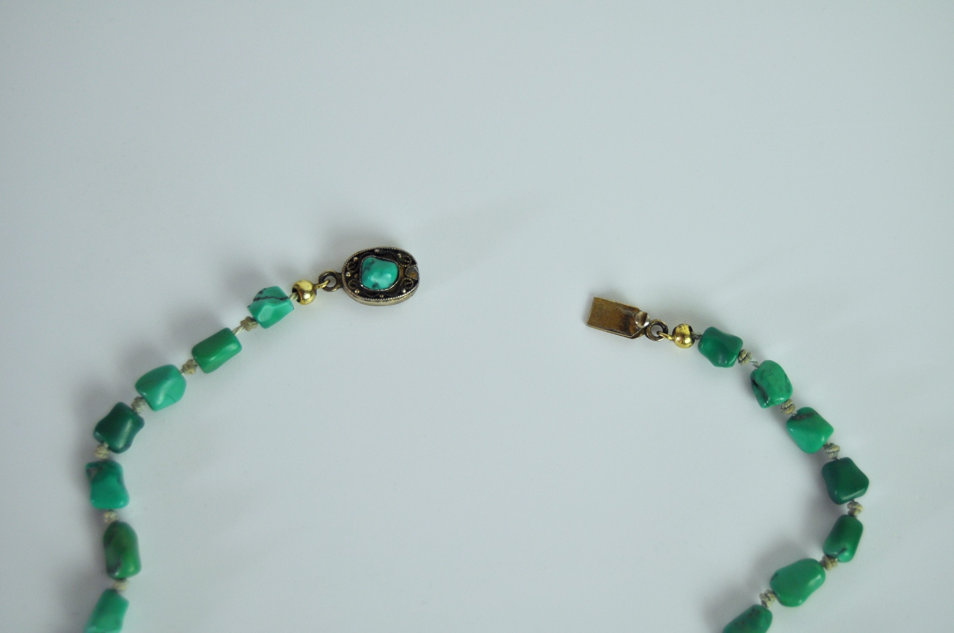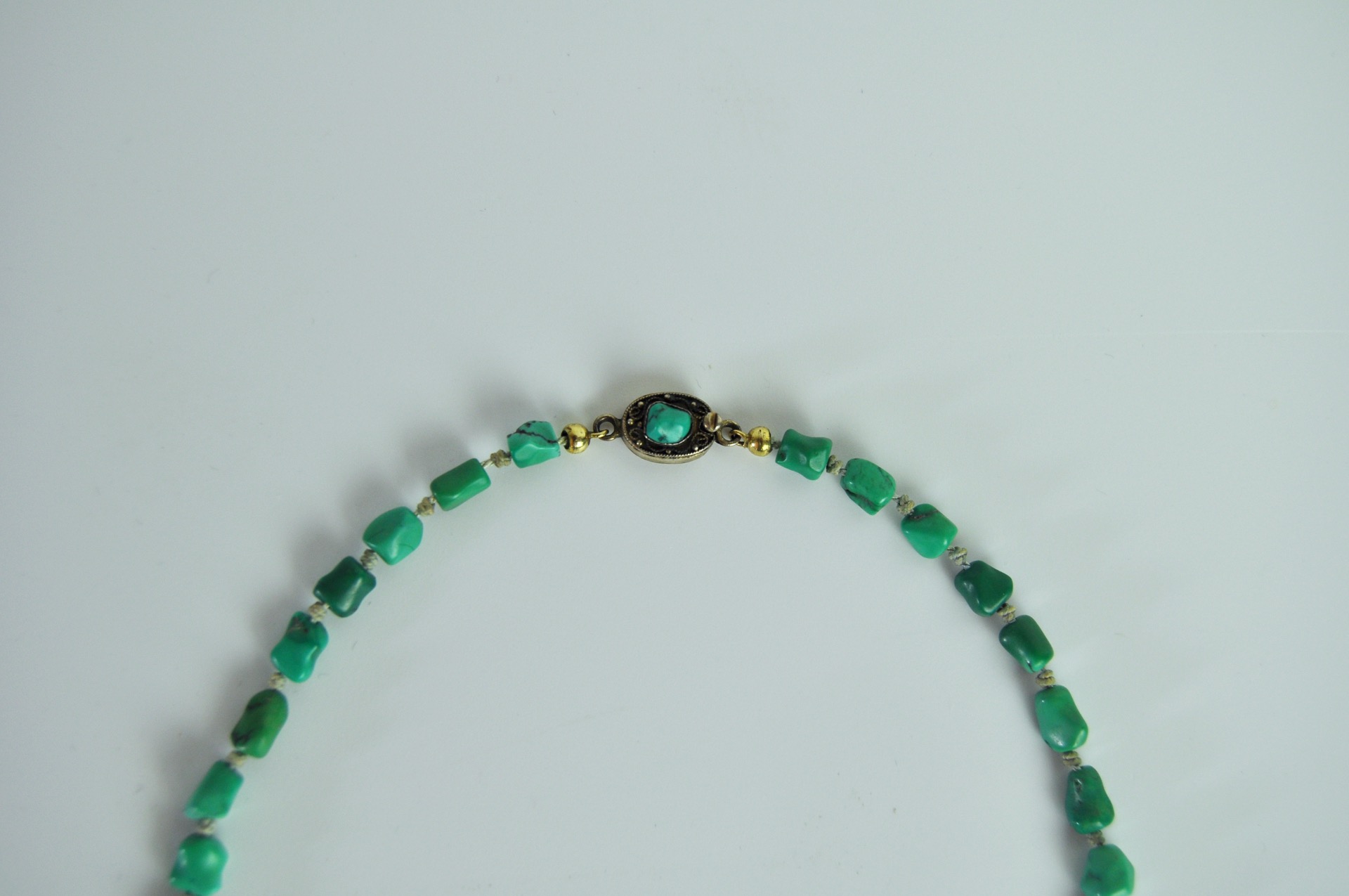 The uniform turquoises are strung on a strong silk cord with knots between the stones The chain is held together by a beautiful filigree clasp.