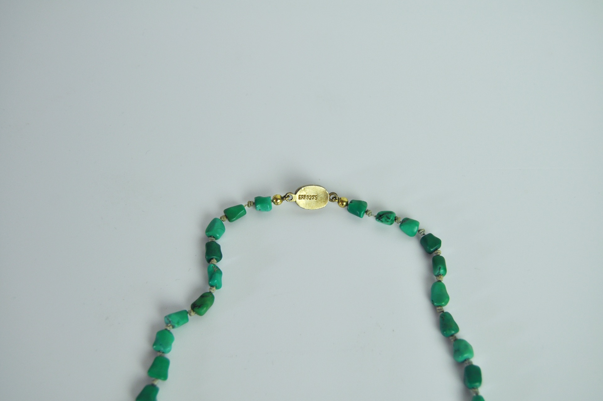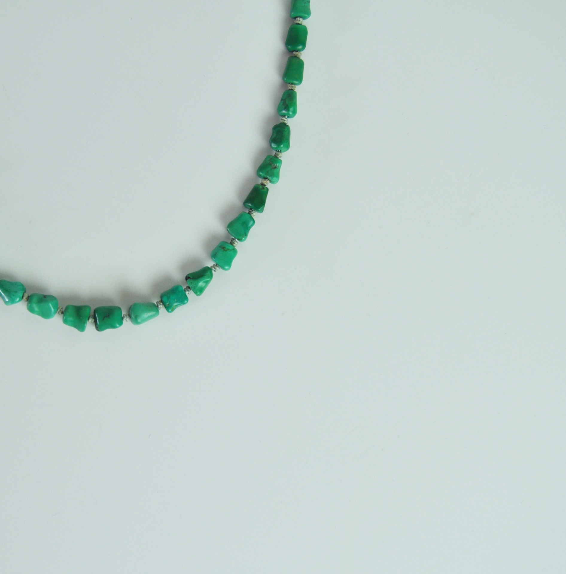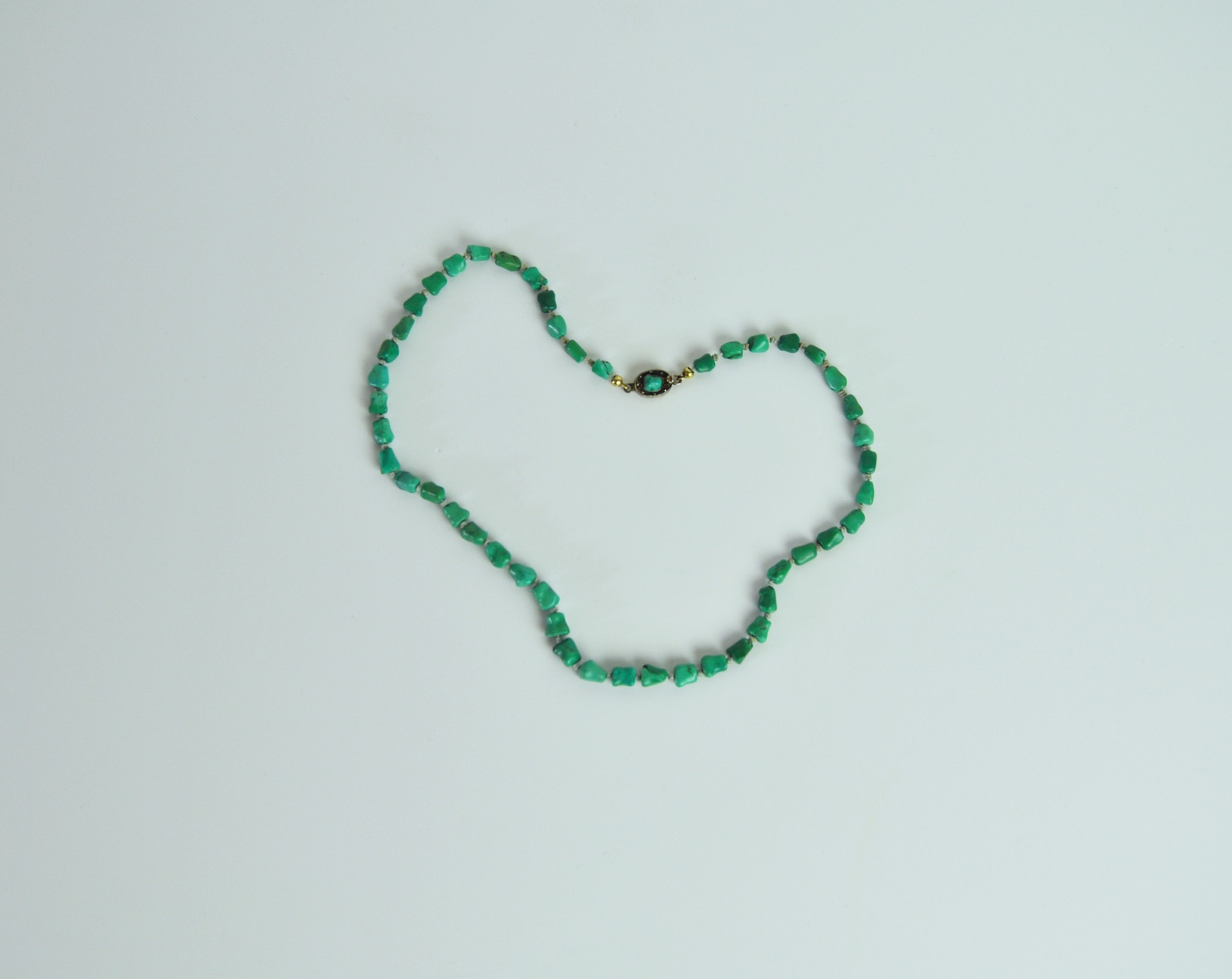 The uniform turquoises are strung on a strong silk cord with knots between the stones The chain is held together by a beautiful filigree clasp.