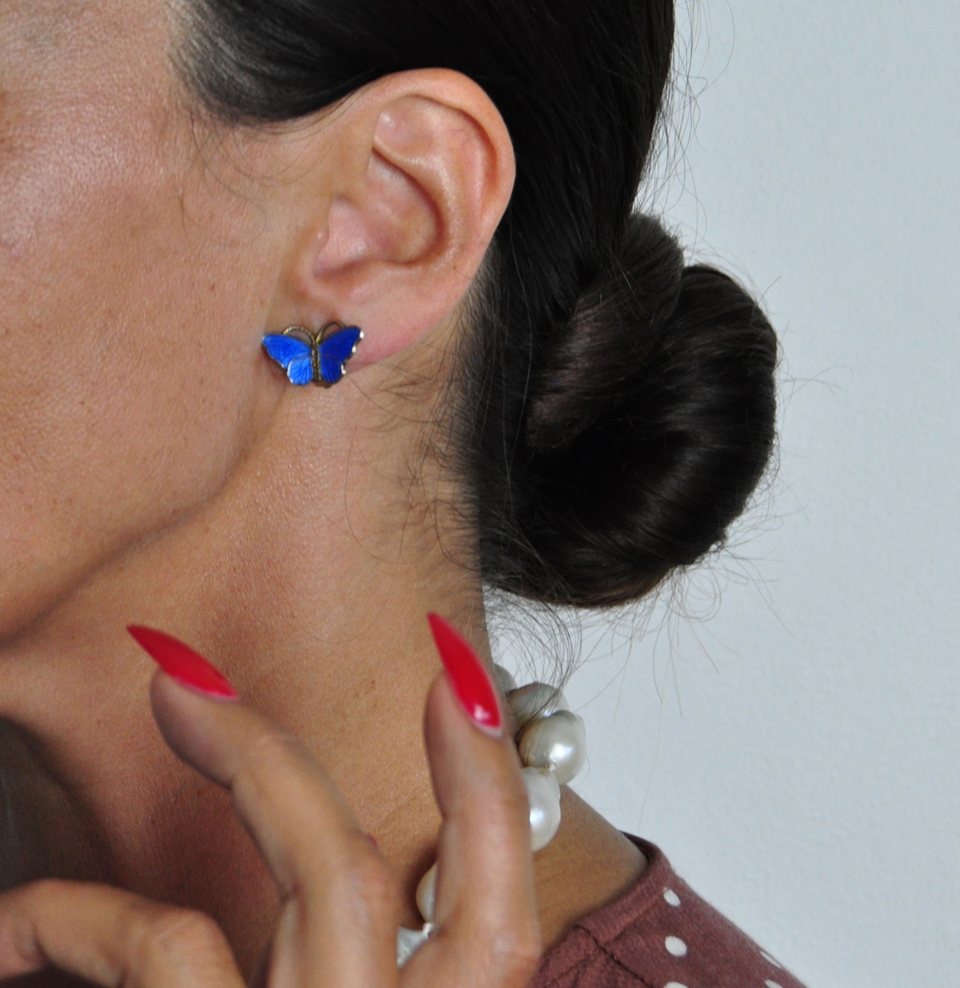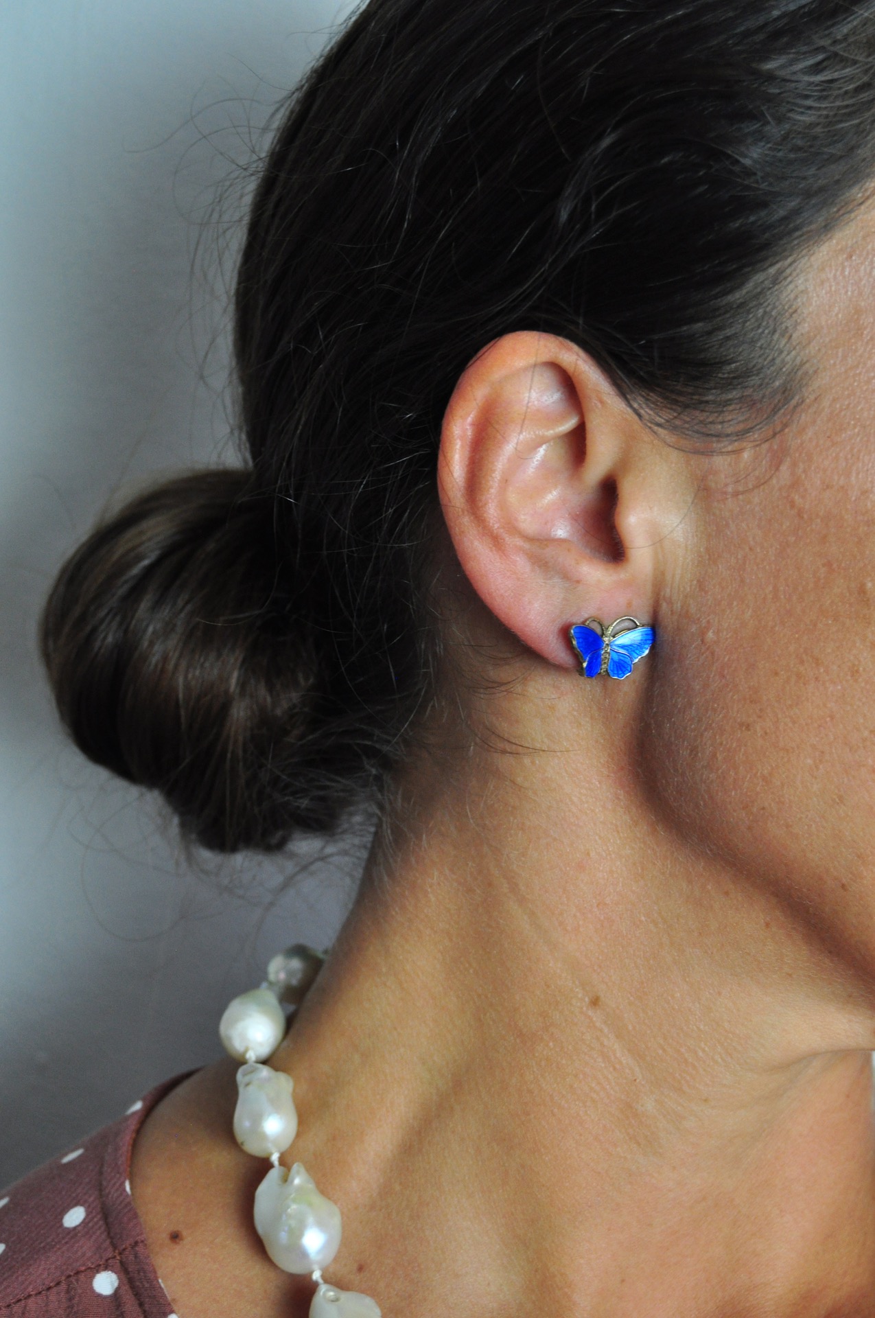 An exquisite pair of silver and enamel butterfly earrings. The ear clips are beautifully crafted in a warm silver with blue enamel wings.