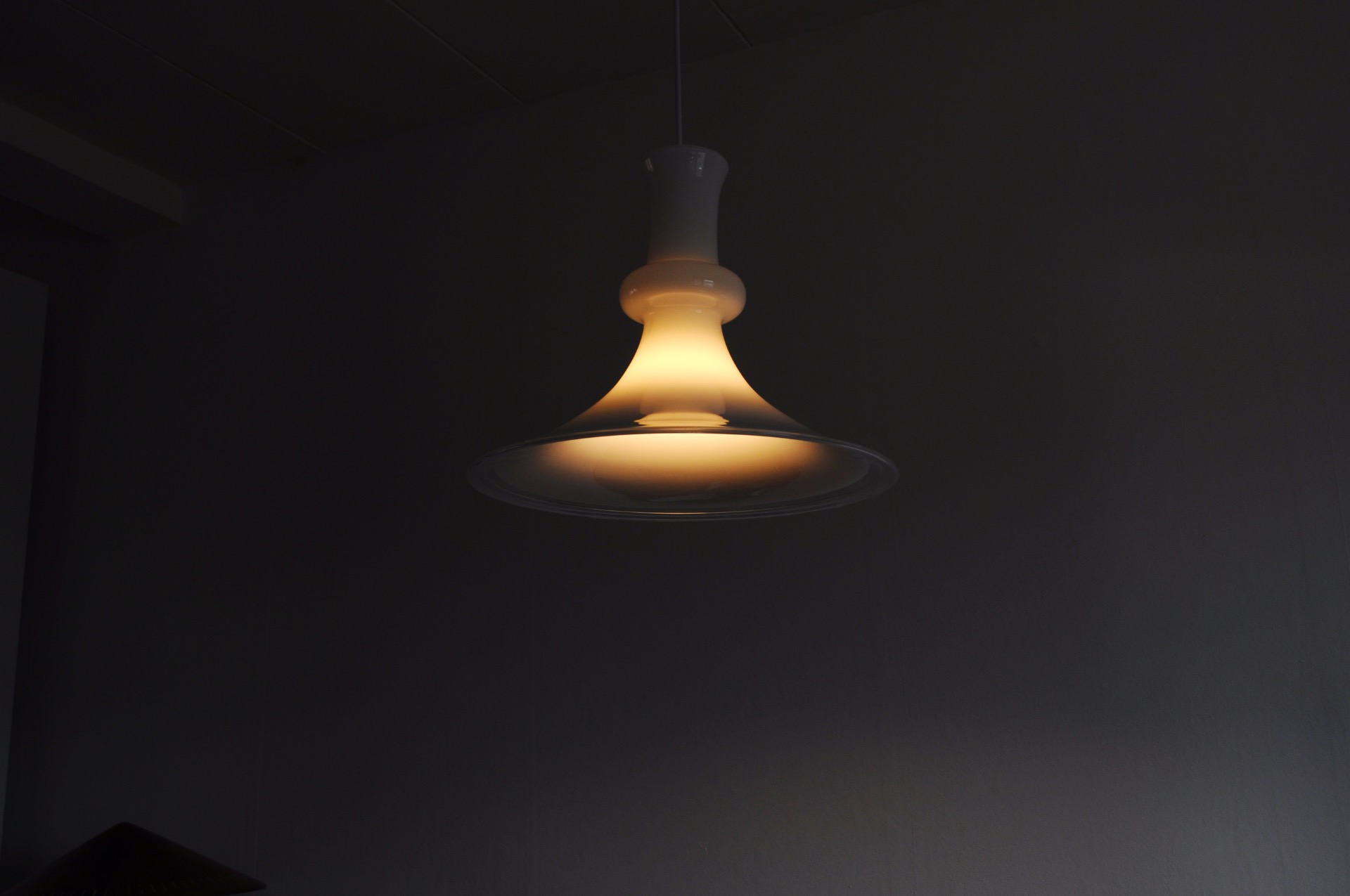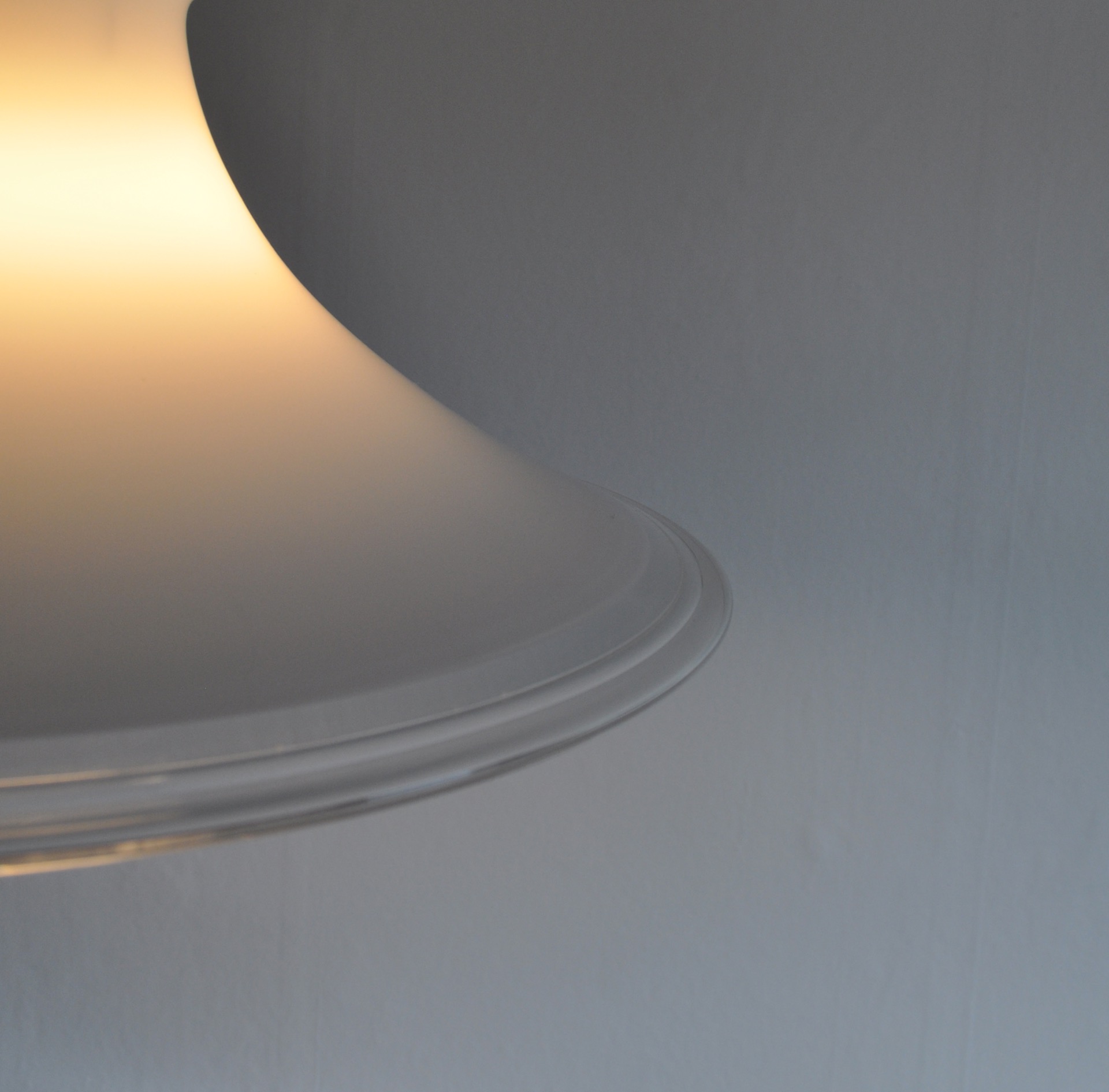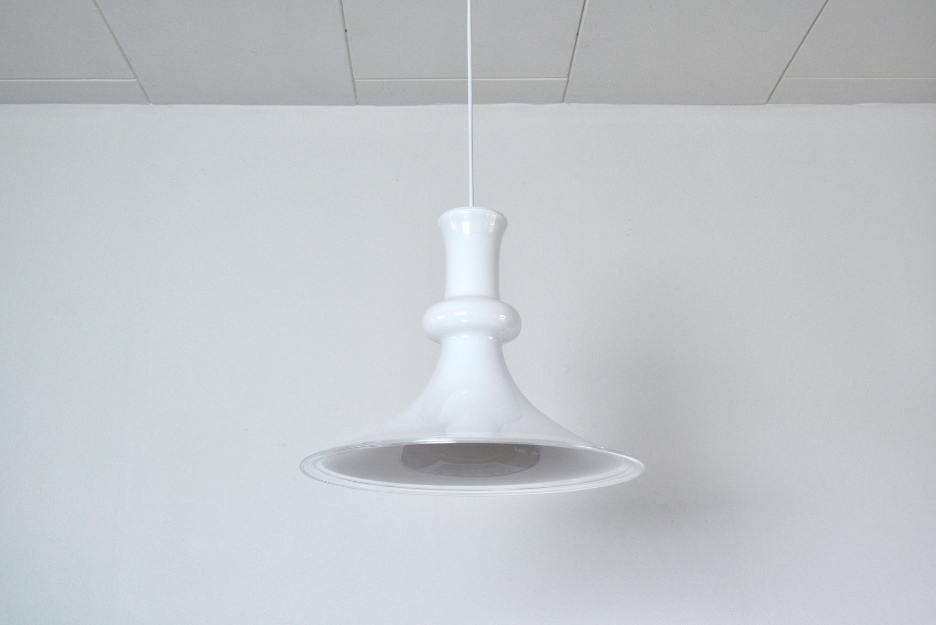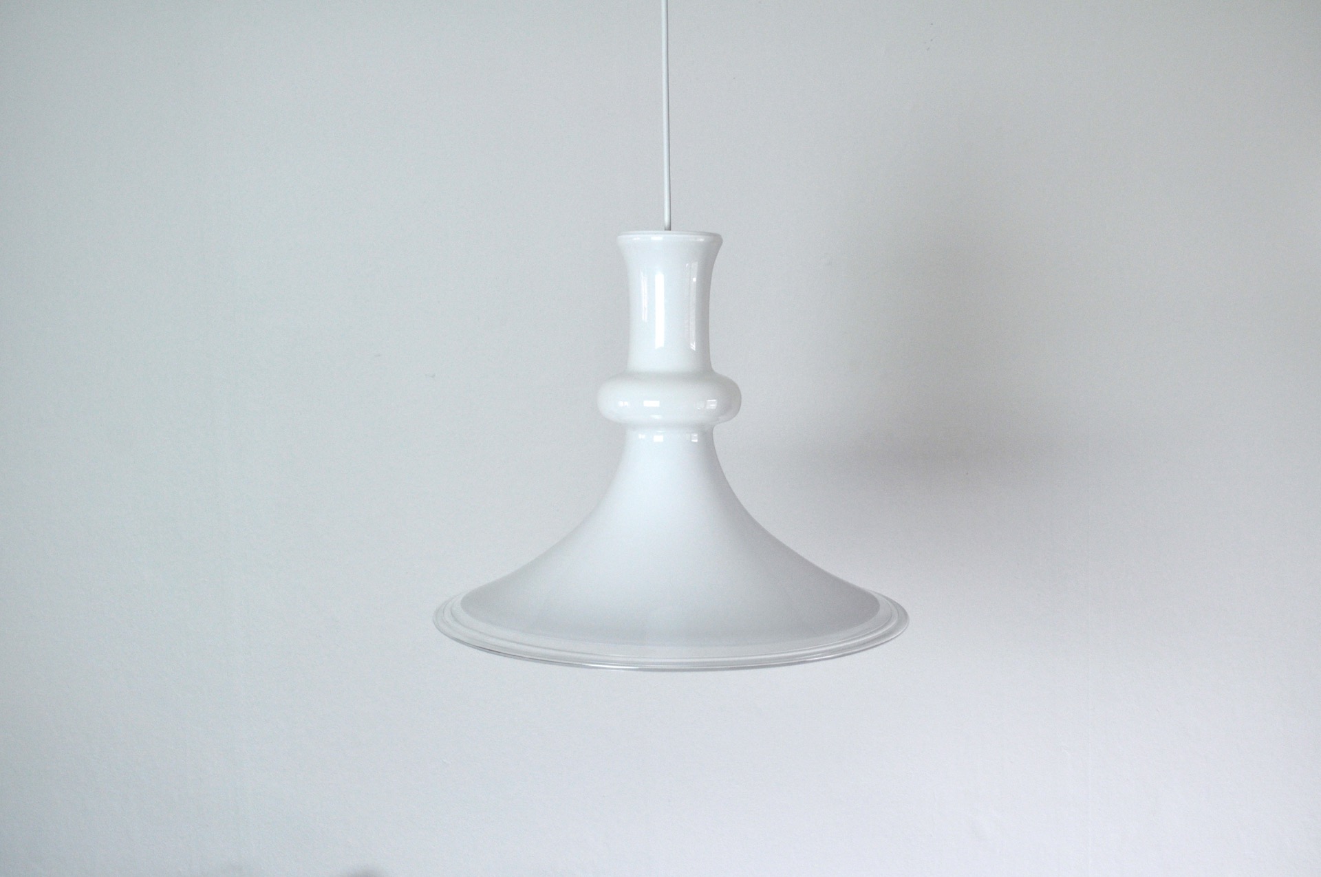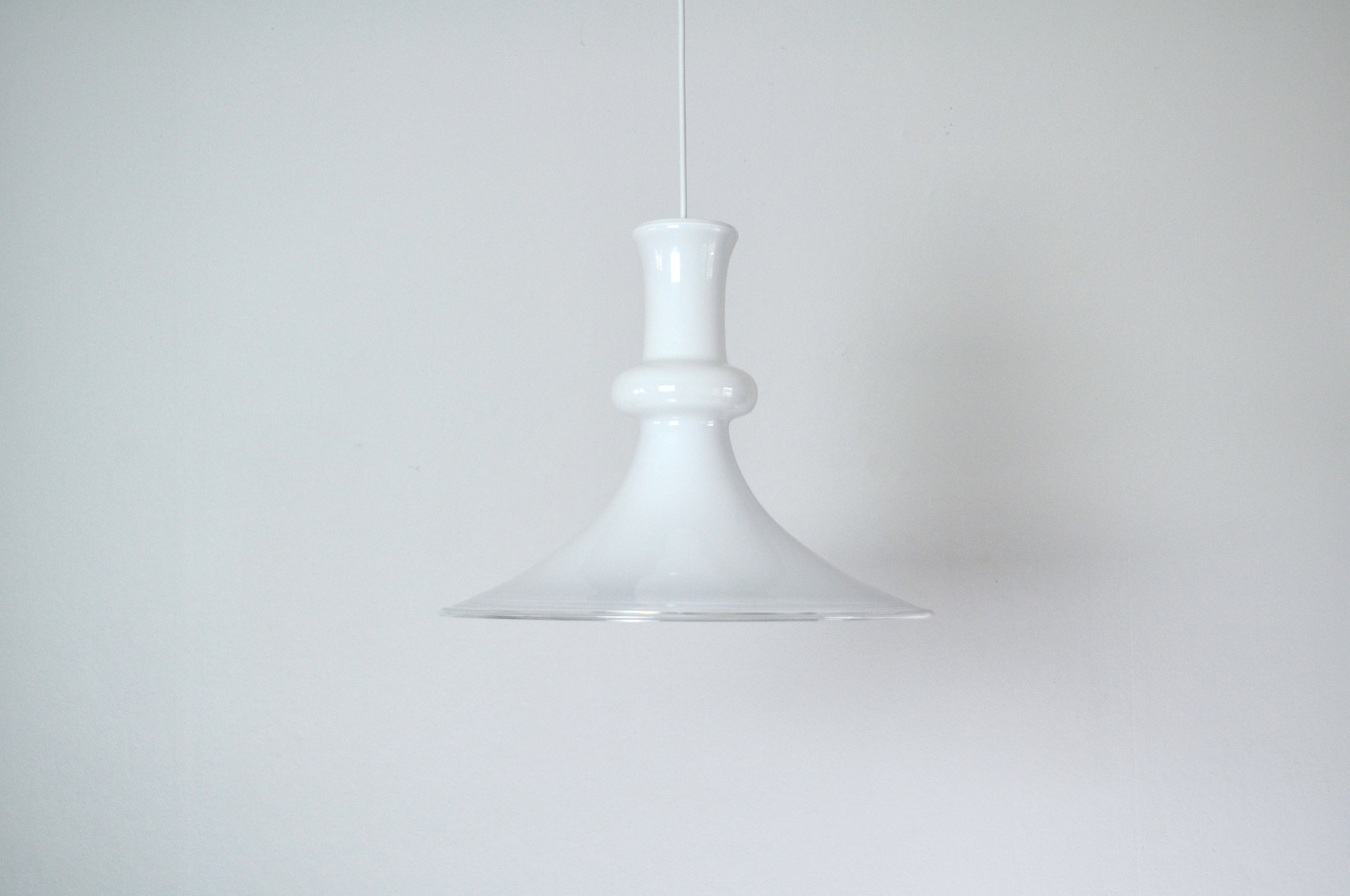 White mouth blown opaline glass pendant "Etude" designed by Michael Bang for Holmegaard (later Royal Copenhagen). Excellent condition, labeled by maker and rewired.